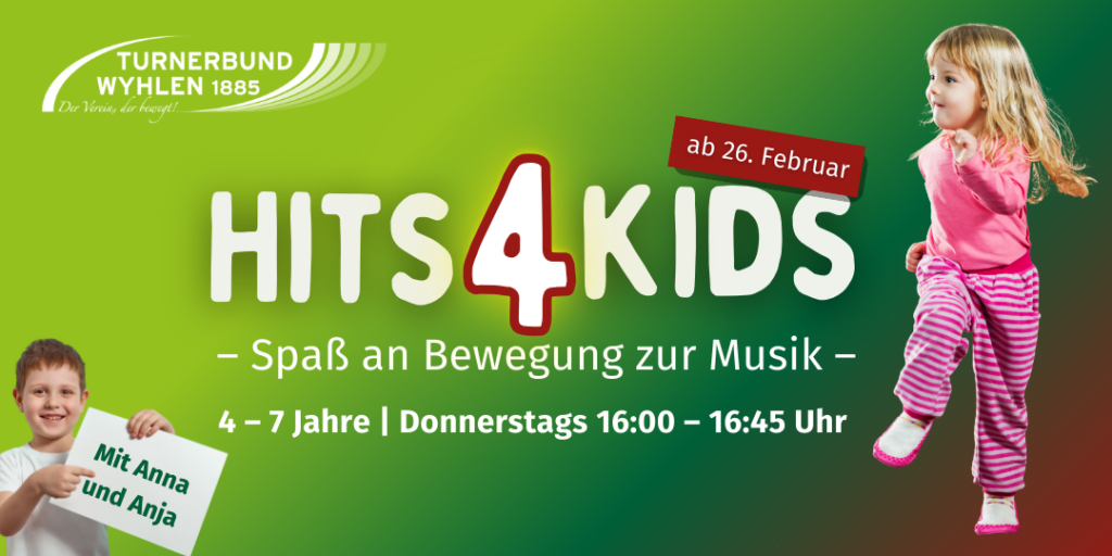 Bei Hits 4 Kids bewegen sich Kinder zu Musik, tanzen fröhliche Bewegungslieder und lernen spielerisch erste Choreografien. Verschiedene Musikrichtungen, Kreativität und vor allem der Spaß an der Bewegung machen jede Stunde zu einem Erlebnis.