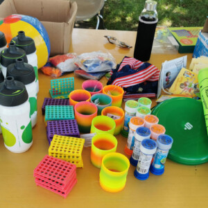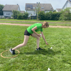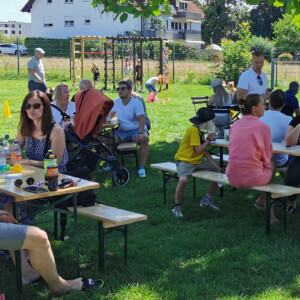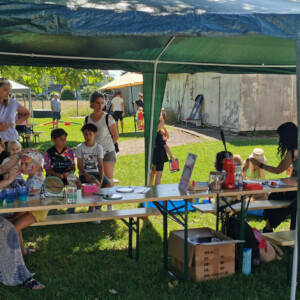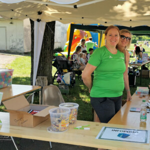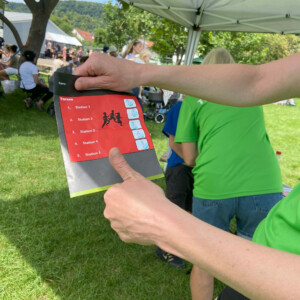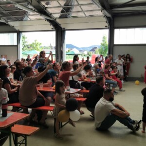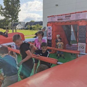Der nächste Tag bot wieder super Wetter. Und wahrscheinlich haben einige noch ein bisschen ausgeschlafen… um 11 war noch recht wenig Betrieb, aber ab 12 da kamen sie, die (jungen) Familien, um die sportlichen Parcours unserer Abteilungen zu absolvieren und sich über die kleinen Preise zu freuen. Und dann etwas zur Stärkung. Kuchen, Eis, Gyros.. Beliebt war wie jedes Jahr das Spielmobil der Gemeinde. Und die kühlen Getränke. Hier gingen uns einige langsam aus, wir konnten aber Alternativen anbieten. Bis zur Endzeit um 16.00 h wuselte es; wieder hatten wir mehr Parcour-Teilnhmer als im Vorjahr. Als Highlight am Ende gab es die Bekanntgabe der Gewinner unseres Gewinnspiels. Und eine Antwort: 295 Bälle waren es.